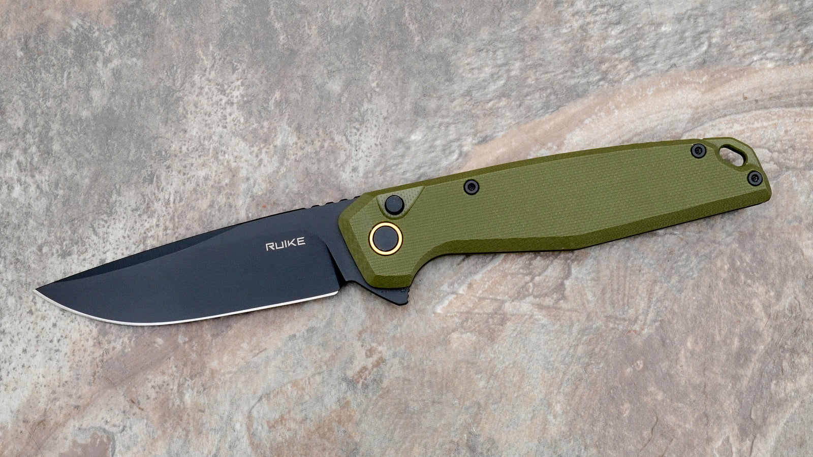 Ruike Button Lock Flipper, Black Blade and Green G-10 Handle P873-G