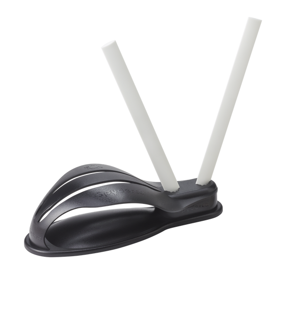 The Galley-V sharpener is a mounted preset angle sharpener with Ceramic (fine) rods. The 9" oval rods allow for sharpening of plain and serrated knives and the preset 40° (20° per side) provides a razor edge on your knife. The base Provides a large hand guard to prevent injury while securly holing the system.