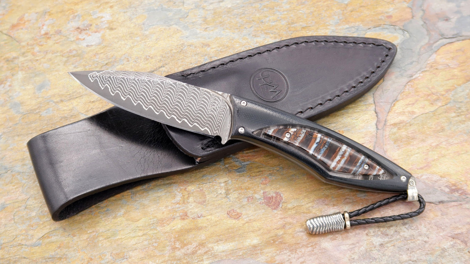 B12-Adventure, Damascus Blade and Handle with Ring Cut Mammoth Tusk