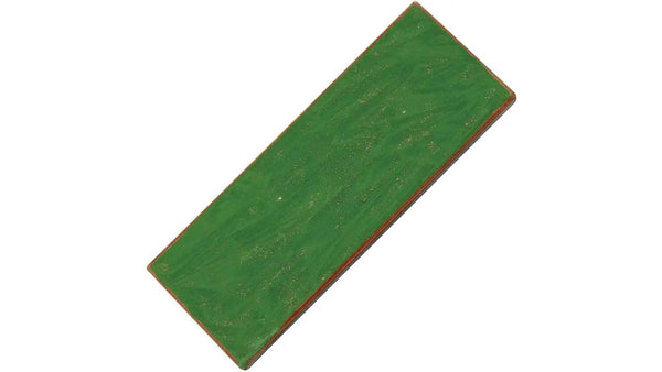 Double sided pre-loaded leather hand held field strop with polycarbonate core. Core cannot lose it's flat surface, nor can it be broken without using tons of force. This material has zero potential to swell, warp or crack when exposed to moisture. The leather has a very low acid content and is pre-loaded with black (coarse) buffing compound on one side and green (fine) buffing compound on the other.