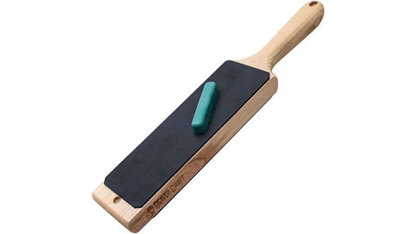 Double sided cowhide leather strop mounted to an Ashwood base with handle. Included is a bar of Green Chromium Oxide compound